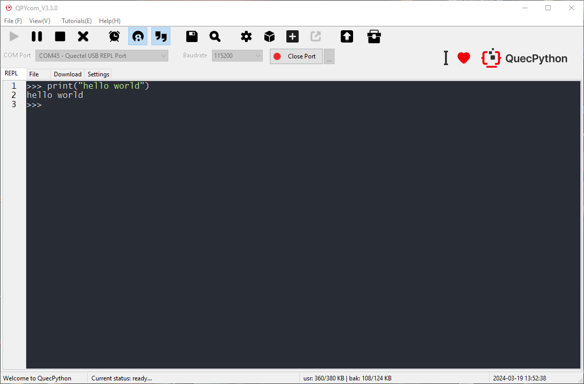 REPL全称为Read-Eval-Print-Loop (交互式解释器),可以在REPL中进行QuecPython程序的调试