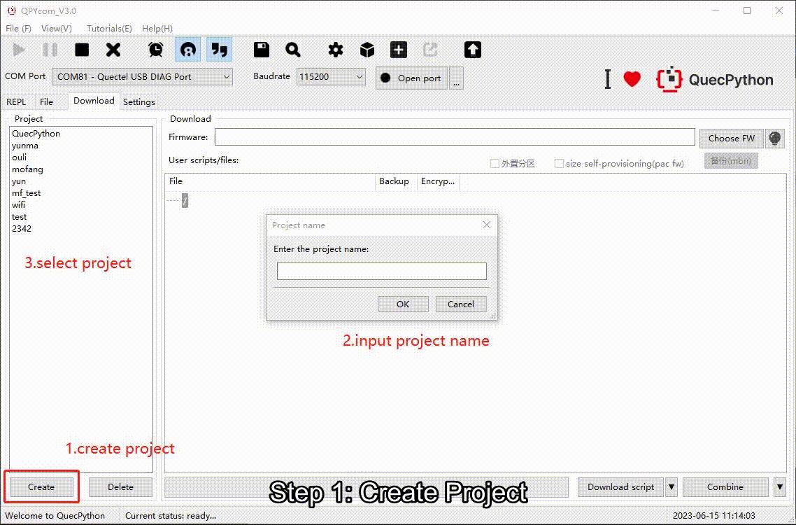首先确保模组连接正常并已开机,打开QPYcom工具进入下载页面,点击"创建"项目,新建要下载的固件项目,项目名称自定义,配置完成后持久化保存