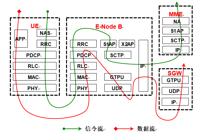 下面是基于蜂窝无线网络分层结构的数据和信令流程示意。