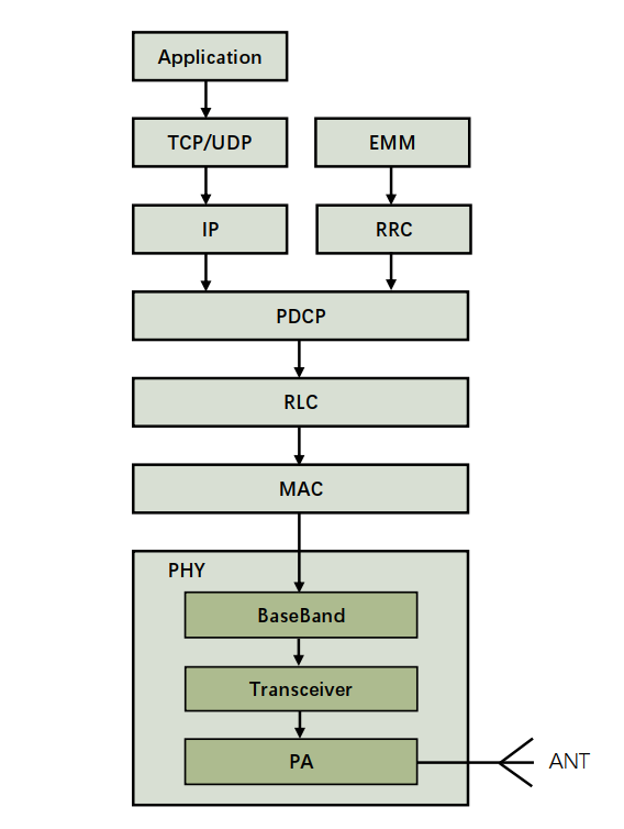 如下是基于蜂窝无线网卡硬件结构的数据流向图。基于该图,可以看到,用户数据在软件上先依次经过TCP/UPD层、IP层、PDCP层、RLC层、MAC层,最终达到物理层(即蜂窝无线网卡)。当数据到达基带部分,会被编码调制,并经过射频部分处理转换为电磁波这种模拟信号,最后再经过功率放大器处理后,通过射频天线发送出去,到达基站。再结合基于蜂窝无线网络分层结构的数据流向图,数据如何从UE达到目的地的过程就很明确了。