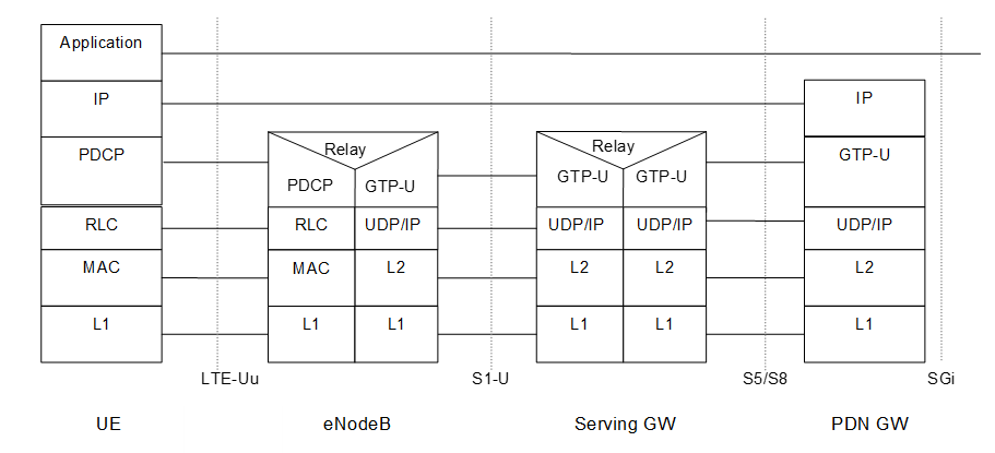下图是LTE网络架构中,用户面的协议栈分层结构示意。该图详细的说明了,用户应用程序是如何与蜂窝无线网络实现数据通信。图中的UE表示用户的终端设备(比如手机),而最右边经过PDN GW后,为互联网中的应用服务器。