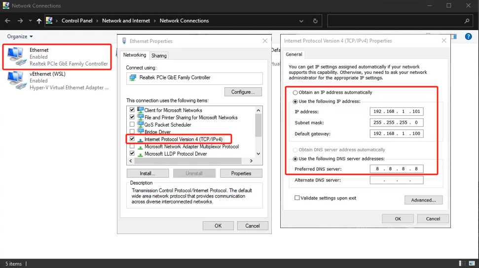右键以太网,选择属性,点击Internet协议版本4(TCP/IPv4),取消自动获得IP地址和自动获得DNS服务器地址,改为如下图所示的静态IP地址,点击确定。