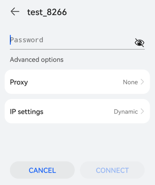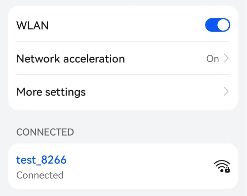 打开手机WLAN界面,找到名称为test_8266的 Wi-Fi 热点,输入密码,进行连接。