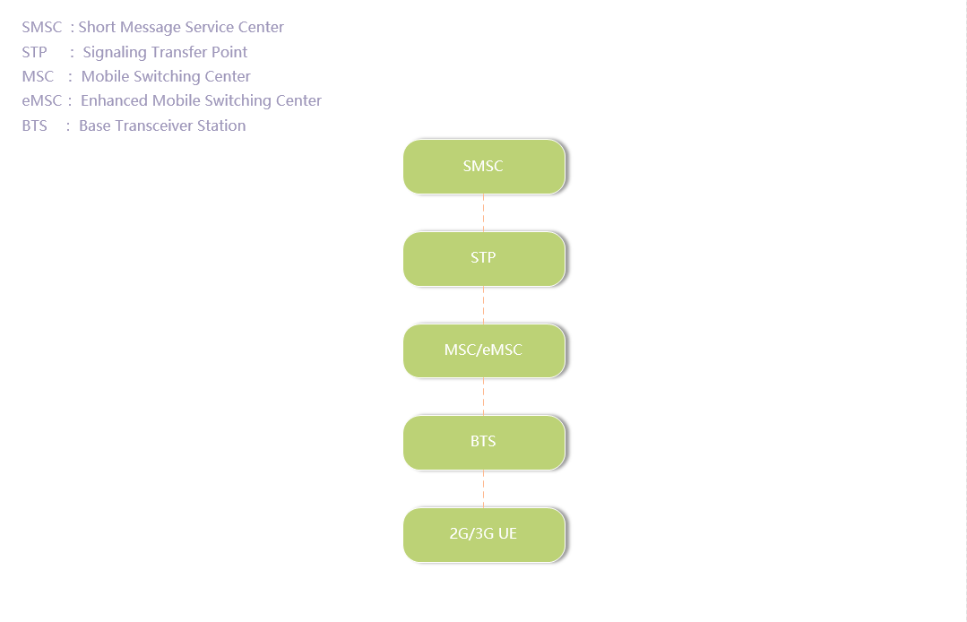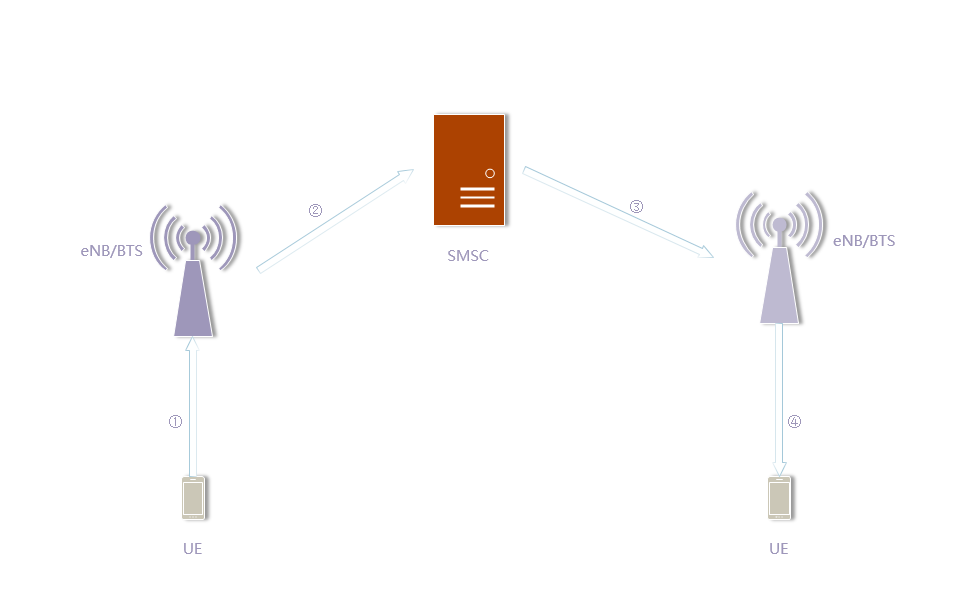 如下图2-1所示,在2G/3G时代,UE设备通过短信收发机将数据最终发送到SMSC,SMSC将收到的信息转发出去,以此完成短信通信。