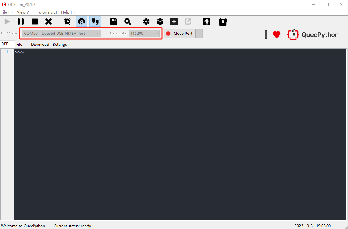 将模块上电,通过 USB 口连接电脑,使用 QPYCOM 工具连接 USB 的 python 交互口。