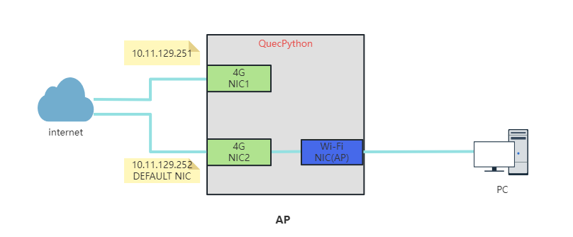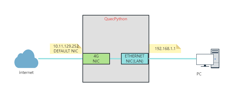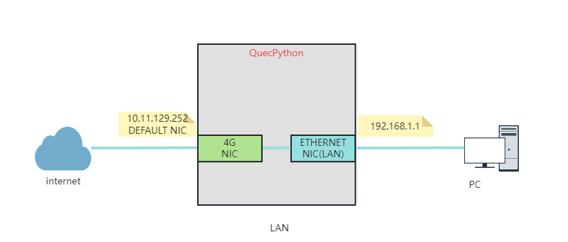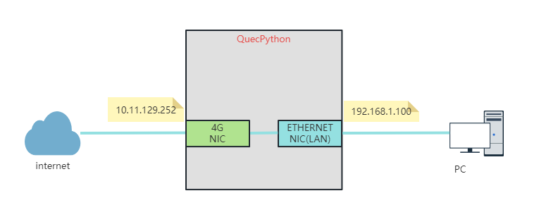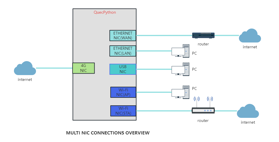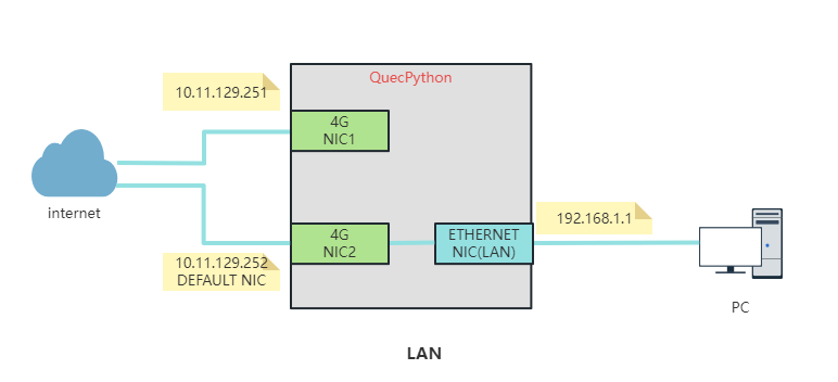对于多种网卡,配置转发关系,当前 QuecPython 尚未提供复杂详细的路由表转发配置功能,我们只需要配置默认网卡即可。再多的网卡,也只有唯一的一个默认网卡,通过默认网卡配置,都会从默认网卡进行 NAT 转发。