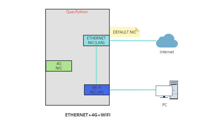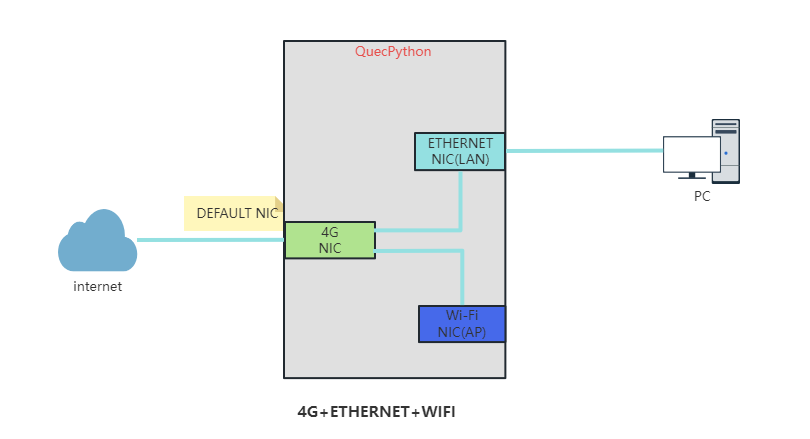 - 使用 4G 作为默认网卡,Wi-Fi 与以太网络通过 4G 转发进行网络访问。
