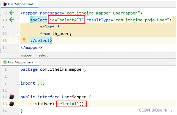 resources下创建com/itheima/mapper目录,并在该目录下创建 UserMapper.xml 映射配置文件<!-- namespace:名称空间。必须是对应接口的全限定名 --> <mapper namespace="com.itheima.mapper.UserMapper"> <select id="selectAll" resultType="com.itheima.pojo.User"> select * from tb_user; </select> </mapper> -