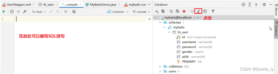 com.itheima包下编写 MybatisDemo 测试类public class MyBatisDemo { public static void main(String[] args) throws IOException { //1. 加载mybatis的核心配置文件,获取 SqlSessionFactory String resource = "mybatis-config.xml"; InputStream inputStream = Resources.getResourceAsStream(resource); SqlSessionFactory sqlSessionFactory = new SqlSessionFactoryBuilder().build(inputStream); //2. 获取SqlSession对象,用它来执行sql SqlSession sqlSession = sqlSessionFactory.openSession(); //3. 执行sql List<User> users = sqlSession.selectList("test.selectAll"); //参数是一个字符串,该字符串必须是映射配置文件的namespace.id System.out.println(users); //4. 释放资源 sqlSession.close(); } }