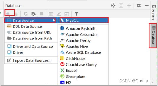 Database,在展开的界面点击+选择Data Source,再选择MySQL