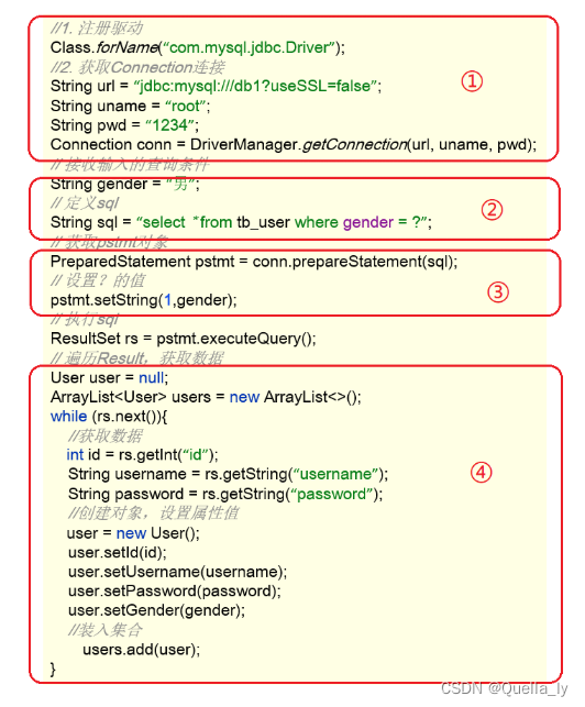 下面是 JDBC 代码,我们通过该代码分析都存在什么缺点: