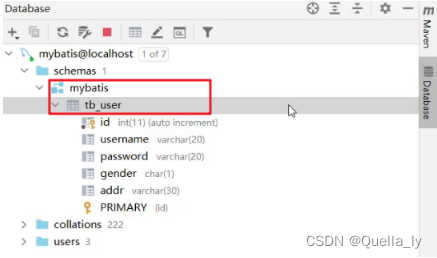 create database mybatis; use mybatis; drop table if exists tb_user; create table tb_user( id int primary key auto_increment, username varchar(20), password varchar(20), gender char(1), addr varchar(30) ); INSERT INTO tb_user VALUES (1, 'zhangsan', '123', '男', '北京'); INSERT INTO tb_user VALUES (2, '李四', '234', '女', '天津'); INSERT INTO tb_user VALUES (3, '王五', '11', '男', '西安'); -