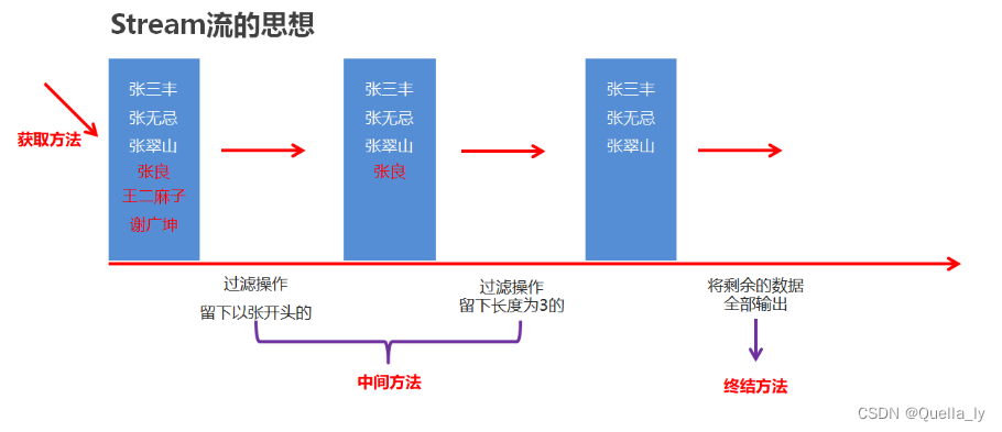 直接阅读代码的字面意思即可完美展示无关逻辑方式的语义:获取流、过滤姓张、过滤长度为3、逐一打印