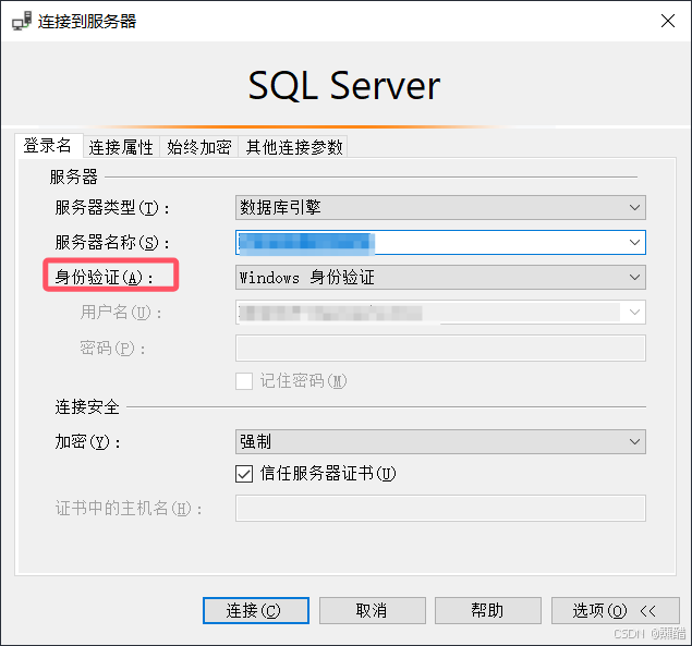 身份验证切换成Windows身份验证,并且勾选信任服务器证书