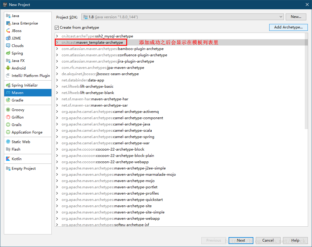 创建新的maven工程,选择Add Archetype,填写刚才添加的骨架工程坐标,点击OK,这是会生成一个新的骨架选项,选中它。再按正常流程创建项目。