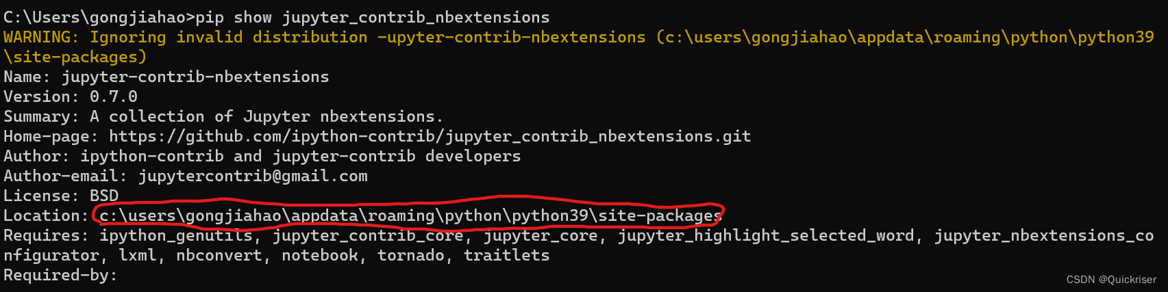 先查看jupyter_contrib_nbextensions的位置,位置如红圈中所示: