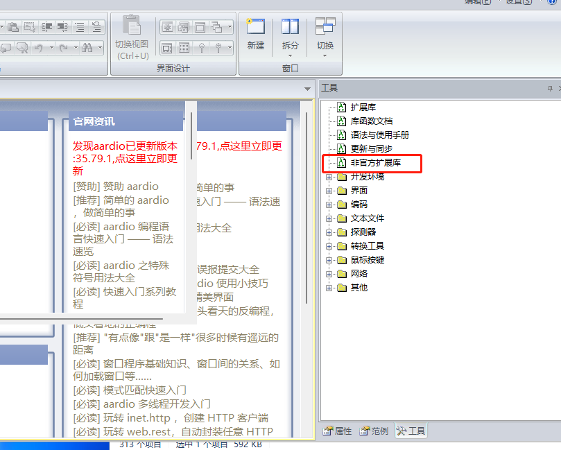 接着重新打开aardio的编辑器,就可以在工具里看到有个非官方扩展库。使用方法和上面的扩展库是一样的,运行它选择需要安装的库,它就会下载好放到aardio\lib目录下