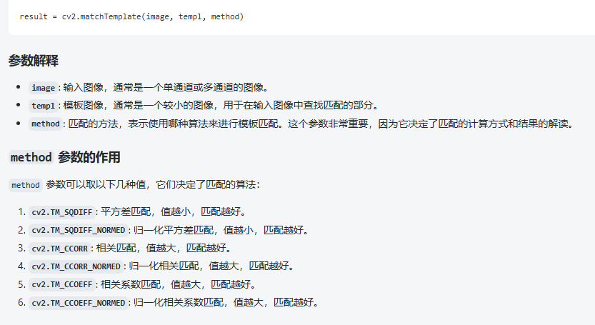 核心函数就是cv2.matchTemplate,它是用来做模版匹配的,通俗点说是在一个图中找出另一张图,看一下gpt的参数解释: