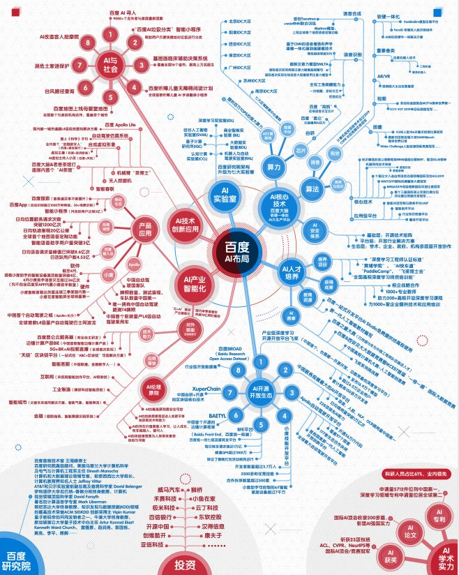 根据国家工业信息安全发展研究中心发布的《人工智能中国专利技术分析报告》,百度以5712件专利位居AI专利申请量榜第一,并包揽了深度学习技术、语音识别、自然语言处理、智能驾驶等多个人工智能核心领域第一。与此同时,百度还拥有国内第一的智能搜索服务量、语音调用量3亿的百度地图、全球出货量第二小度语音智能产品、中国自动驾驶第一品牌Apollo等。