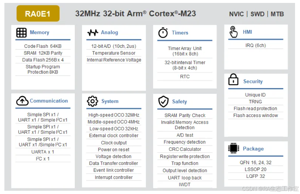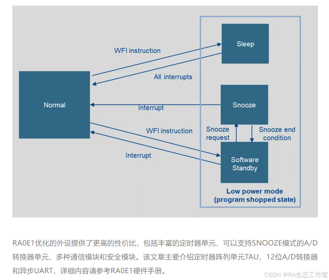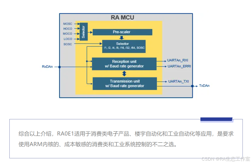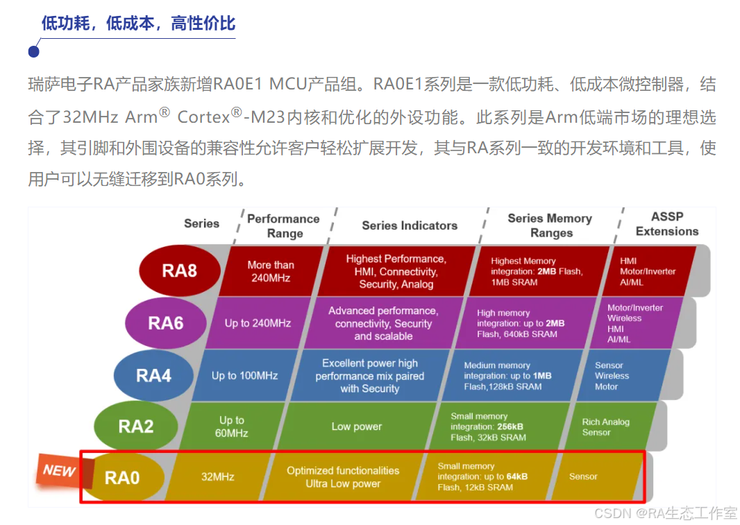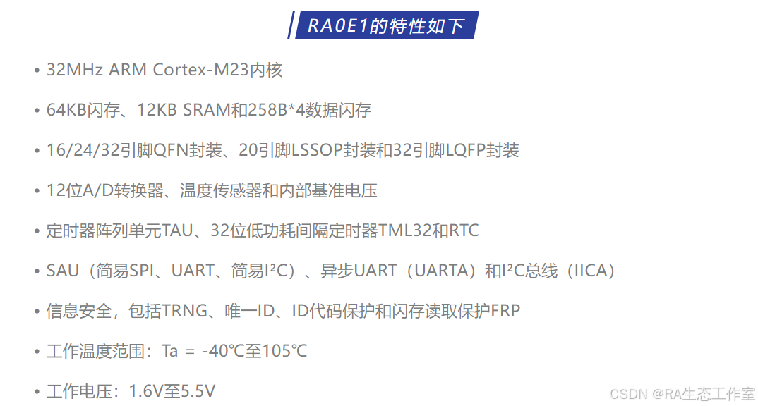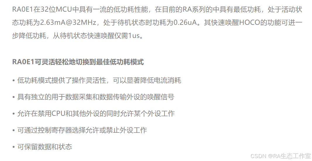 更多RA0E1详细内容请参考瑞萨官网:https://www.renesas.cn/cn/zh/products/microcontrollers-microprocessors/ra-cortex-m-mcus/ra0e1-32mhz-arm-cortex-m23-entry-level-ultra-low-power-general-purpose-microcontroller RA0E1 Group User's Manual: Hardware https://www.renesas.cn/cn/zh/document/mah/ra0e1-group-users-manual-hardware