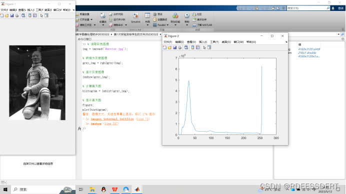 1、读取彩色图像Warrior.jpg,将其转换为灰度图像,查看它的直方图, 请编程实现。