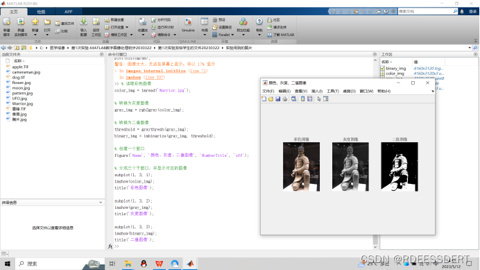 2.读取彩色图像Warrior.jpg, 将其转换为灰度图像和二值图像, 在同一个窗口内分成三个子窗口分别显示彩色图像、灰度图像和二值图像, 标注文字标题, 请编程实现。