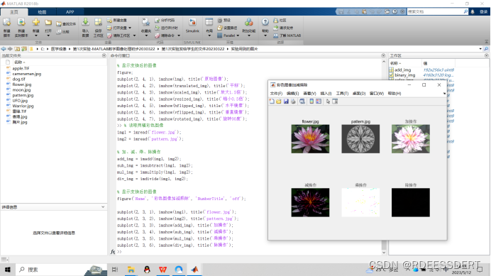 4.读取两幅不同彩色图像:flower.jpg和pattern.jpg,对这两幅图像分别执行加、减、乘、除操作, 在同一个窗口内分成五个子窗口分别显示, 标注文字标题,请编程实现。
