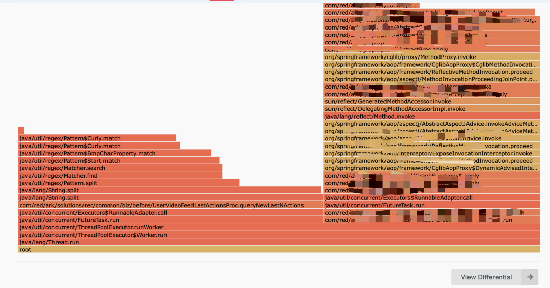 火焰图是一种比较理想的展示函数调用关系的形式,同时也可以方便的定位其在整体中的位置。因此,我们通过定制化的差分火焰图,展示退化点对应的详细函数栈情况,并用颜色来标记、突出性能退化点,用不同的颜色来区分退化的程度;同时在火焰图上展示对应的 CPU 核数,来强化退化程度,增加火焰图的表达内容。