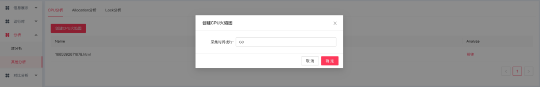 同时,基于 profiling 工具,如 async-profler,用户可以一键生成 cpu、alloc 及 lock 的火焰图,并在线展示。通过这些火焰图,能很方便找到系统的一些热点,从而有针对性的去优化。