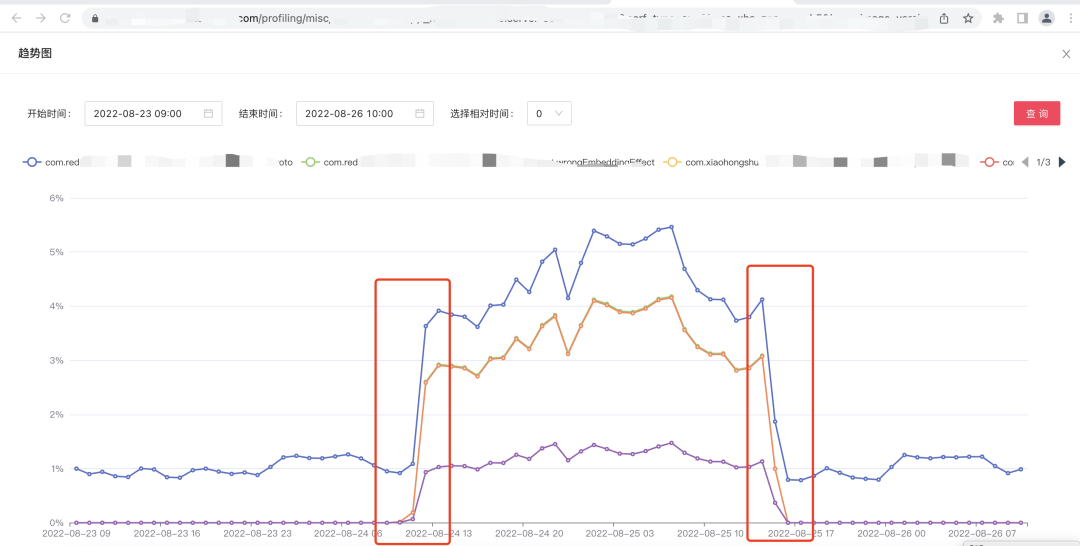 如上图所示,这是一个线上应用性能退化的实际 case,通过函数调用链的 CPU 使用率趋势图可以看出性能退化发生的起始点,同时可以看出该性能退化是否得到了修复、何时修复,这样可以清晰的看到性能退化问题的过程,方便持续追踪性能问题。
