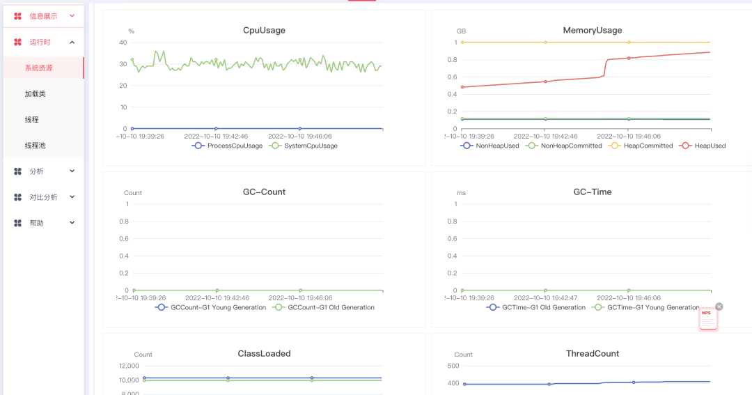 这块主要涵盖一些秒级运行时的 Metrics(如 CPU 利用率,GC 信息),loaded class,线程池状态等。这块作为大盘指标的补充,在 agent 测内嵌了一个小型的时序数据库,直接在端上存储几个重要的秒级指标。帮助用户捕捉一些更细粒度的信号。