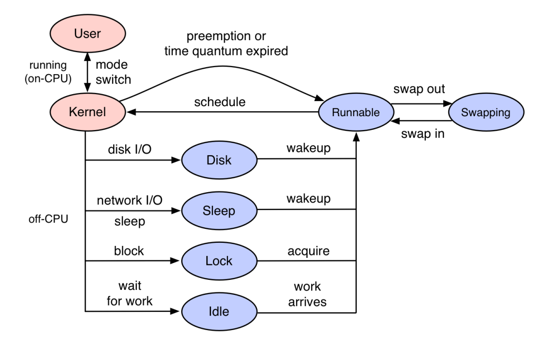 一般的 CPU profiling 是 On-CPU,也就是 CPU 时间花费在哪些代码执行上。在 On-CPU 之外,还有 Off-CPU,指的是进程不在 CPU 上运行运行的时间,比如进程因为 IO、锁等原因处于等待,花费了时间。所以,Off-CPU 是对 On-CPU 的补充,整体关系如下: