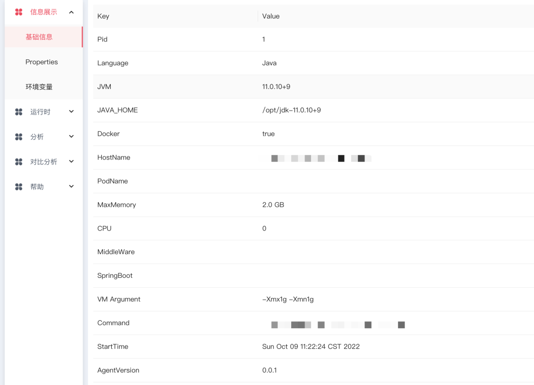 这部分主要展示一些进程和环境相关的基础信息,OS、JVM、机器配置、启动参数、环境变量等。方便用户迅速了解一些应用的基本信息。