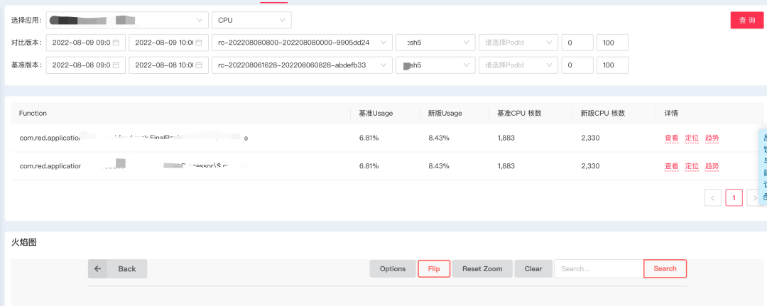 通过性能数据 merge + diff 分析:根据查询条件,在将新版本和基准版本分别进行数据聚合后,进行对比;通过分析对比后的 diff,发现异常变化点并判断是否有性能退(精确到函数)。当前支持机房、版本和时间区间等多种条件。