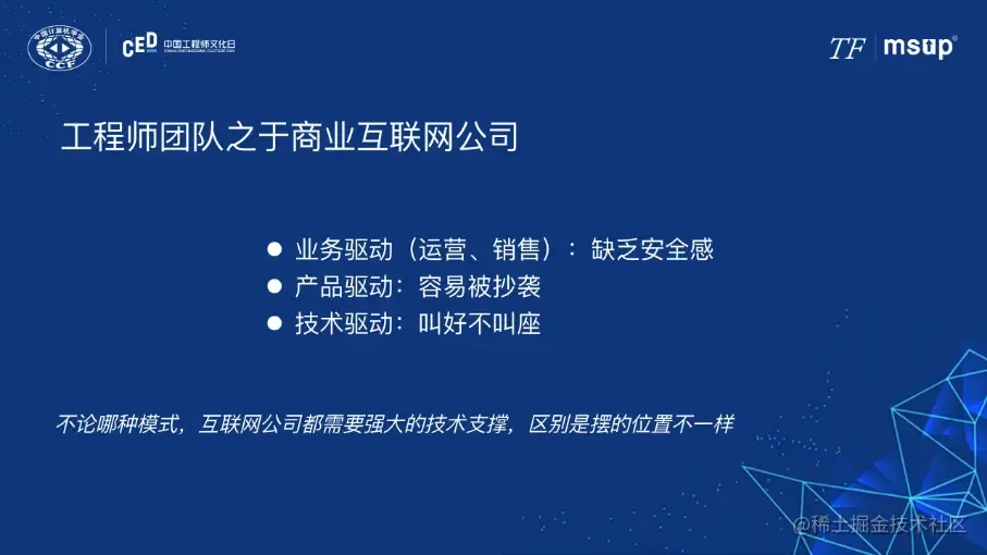 不论哪种模式,技术都是互联网公司背后的强大支撑——技术团队都在其中扮演着非常重要的角色。纵观高增长的公司,往往会看到其中工程师团队在员工总数里面大约占到一半甚至以上,由此也可以看出在互联网行业中工程师团队的重要性。