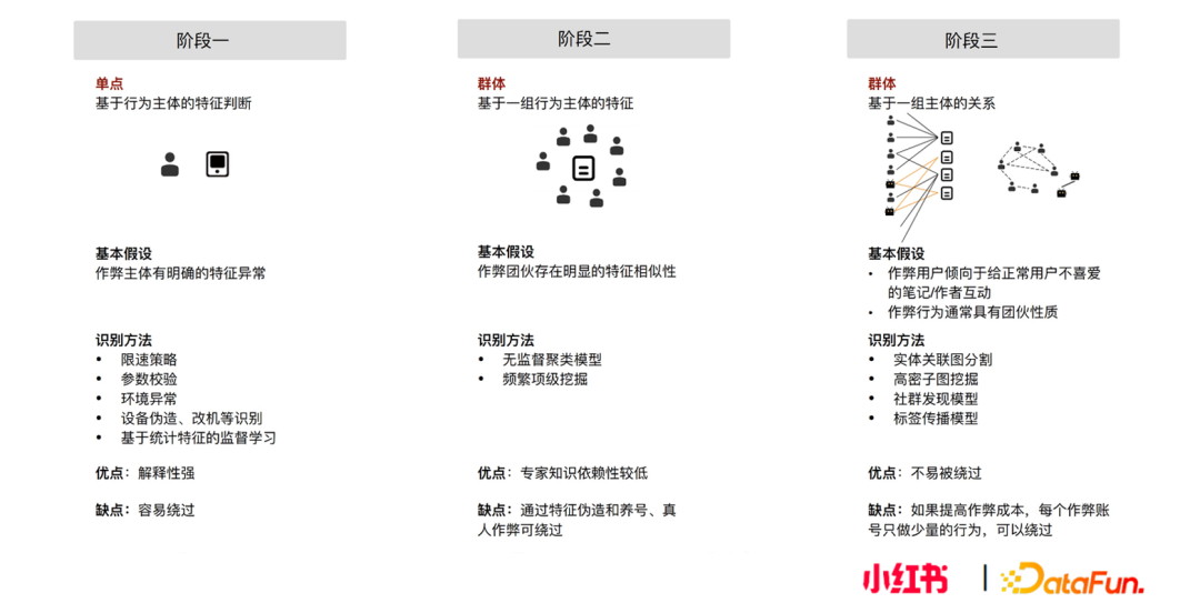 数据刷量的风险识别实践分为三个阶段,随着对抗的展开识别方案不断迭代。
