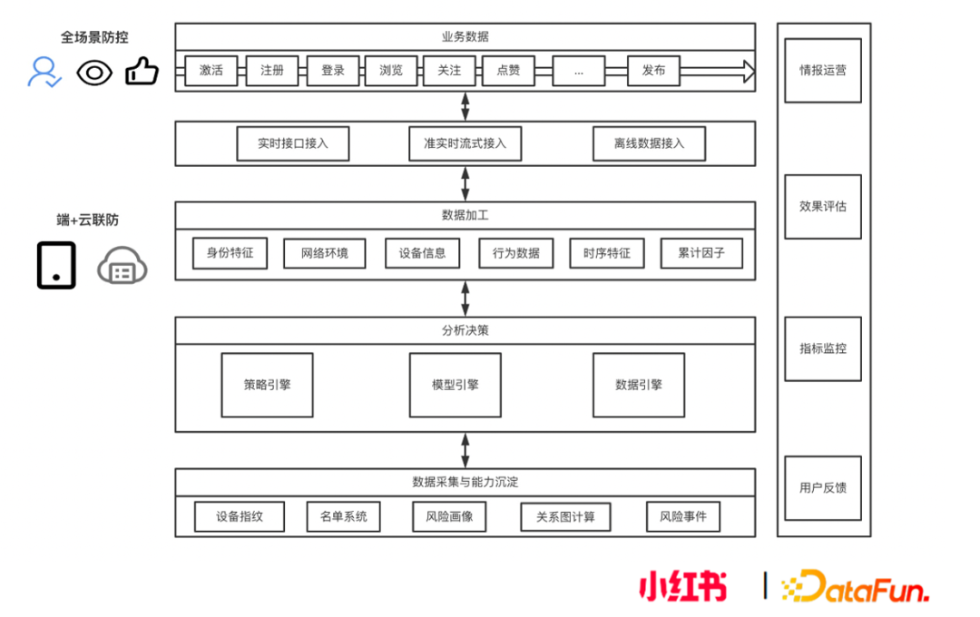 小红书的风控体系,分为业务数据接入层,数据加工层,分析决策层,数据采集能力沉淀及运营和评估模块。