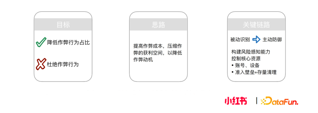 面对已知风险和产业链,下面来讨论下整个作弊防控的策略。所谓策略须先明确作弊防控的目标,以及达到目标的关键路径。