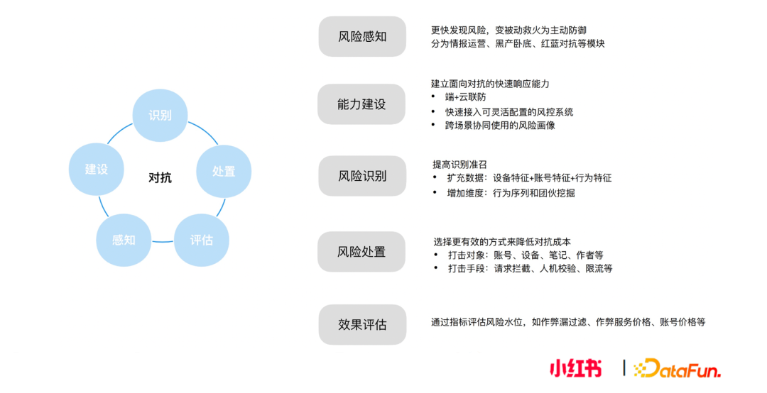 下面对作弊防控思路做进一步的拆解,也是一个比较通用的方法论,个人认为可以应用到各类风险控制场景里。首先业务风控最大的难点是对抗,无论作弊变成何种形式,唯一不变的就是对抗,它是一直存在的。围绕对抗抽象出几个模块:风险感知、能力建设、风险识别、风险处置、效果评估。在遇到新的对抗时,这几个环节间会进行不断的循环迭代。下面以小红书社区反作弊为例,具体介绍这几个模块的设置。