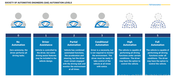在 SAE (Society of Automotive Engineers 美国汽车工程师学会) 的定义中,自动驾驶被划分为 Level 0 到 Level 5 共六个等级: