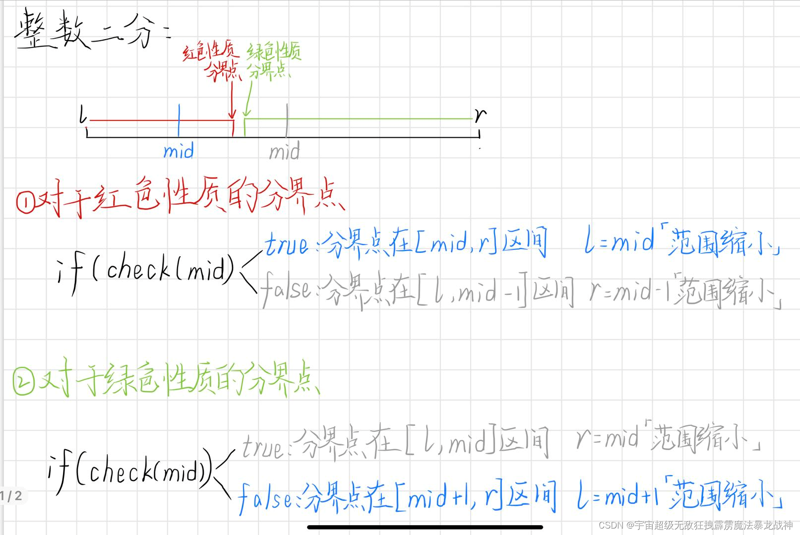 (4)二分的本质是边界:只要找到某种性质,使得整个区间一分为二,那么就可以用二分把边界 点二分出来,二分既可寻找绿色边界,又可寻找红色边界;
