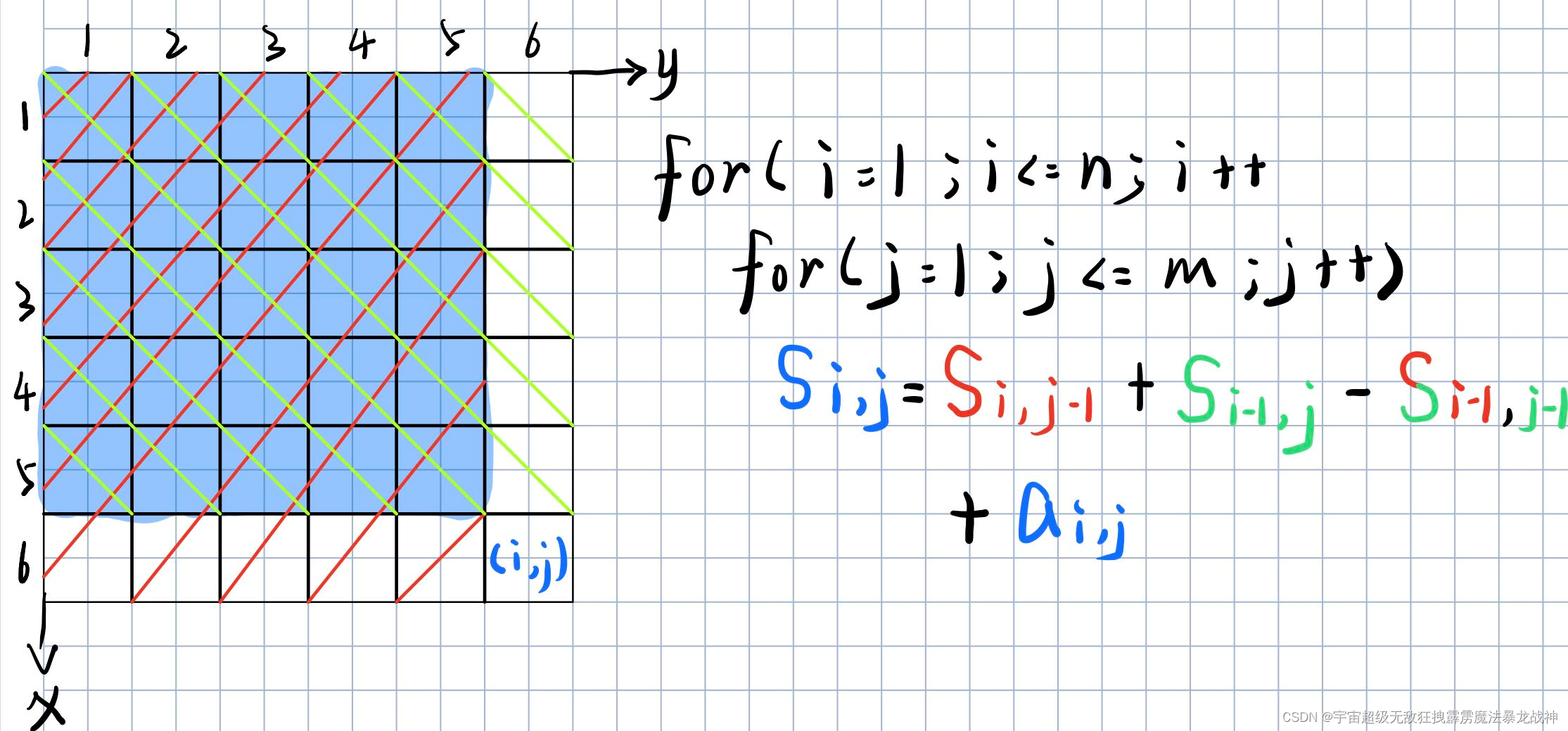 a[i][j] = a[i - 1][j] + a[i][j - 1] - a[i - 1][j - 1] + a[i][j]; // 计算前缀和