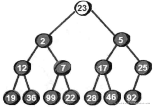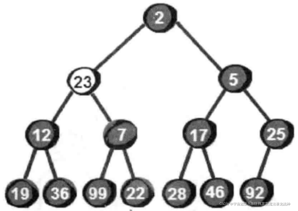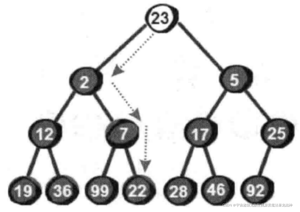 我们发现此时还是不符合最小堆的特性,因此还需要继续向下调整。于是继续将23与它的两个儿子12和7比较,选择一个交换,交换之后如下:
