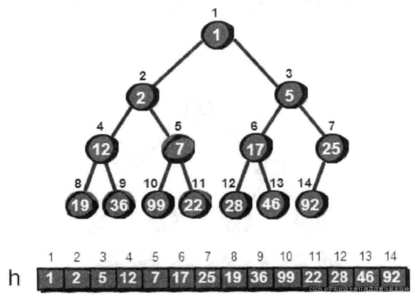 此二叉树的特点:所有父结点都比子结点要小(圆圈里面的数是值,圆圈上面的数是此结点编号)符合这样特点的完全二叉树我们称为最小堆。反之,如果所有父结点都比子结点要大,这样的完全二叉树称为最大堆。(金字塔,上面的牛逼)