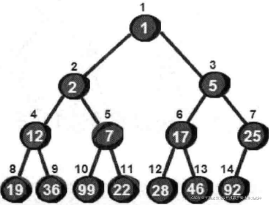 首先把这14个数按照最小堆的要求(就是所有父结点都比子结点要小)放入一棵完全二叉树: