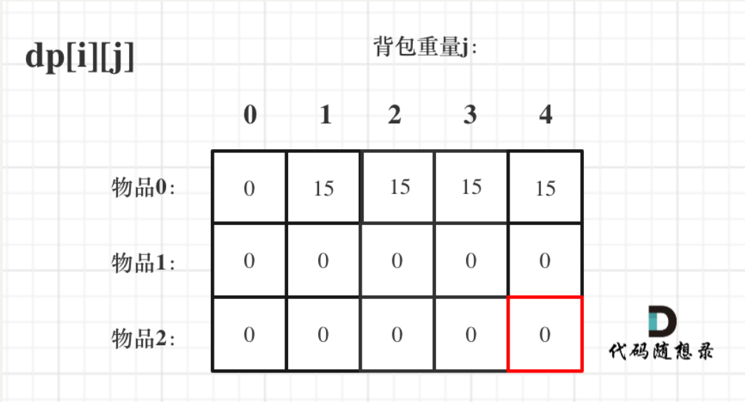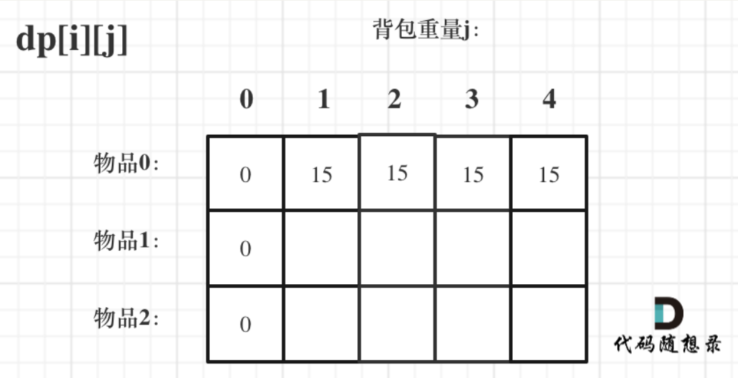 那么很明显当 j < weight[0]的时候,dp[0][j] 应该是 0,因为背包容量⽐编号0的物品重量还