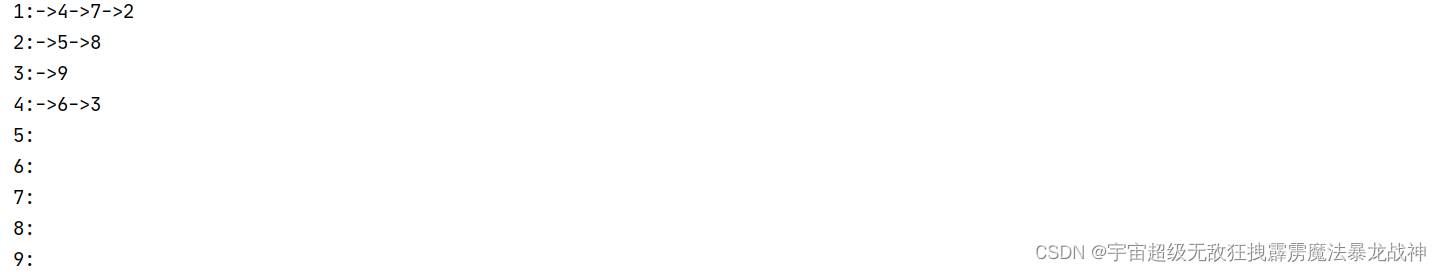 pw.print("->" + e[j]); // 输出表头的邻接节点