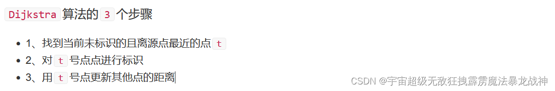 // 通过上述操作当前我们的t代表就是剩下未确定最短路的点中距离起点最短的点,与此同时,该点的最短路径也已经确定,我们将此点标记