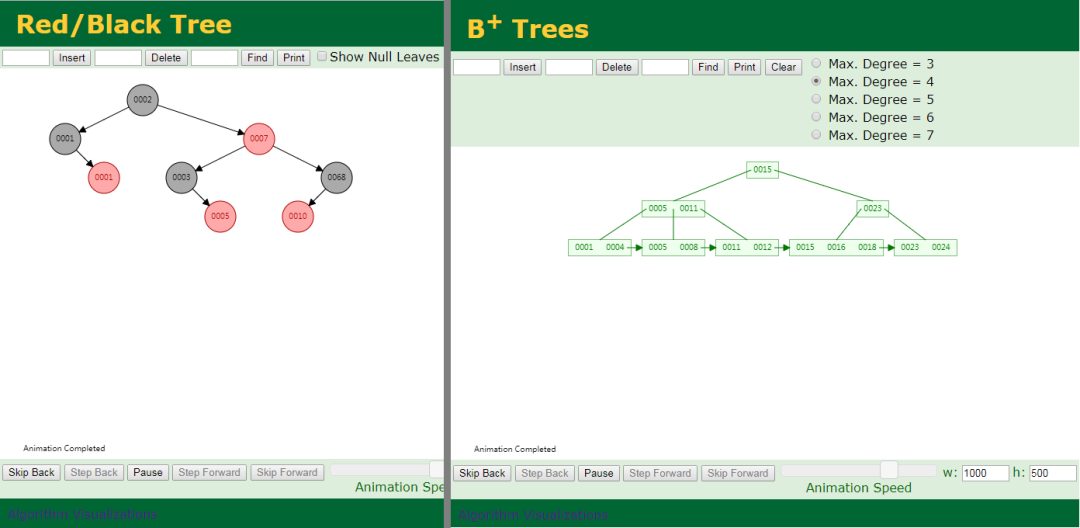 其实从这里我们也能大概看出红黑树和B+树的一些区别,上图B+树中的元素比红黑树多,然而树的高度却比红黑树低。这一特点就决定了在数据库场景中,不可能用红黑树做索引,那会导致树高度非常高。这种可视化的方式体感很强。