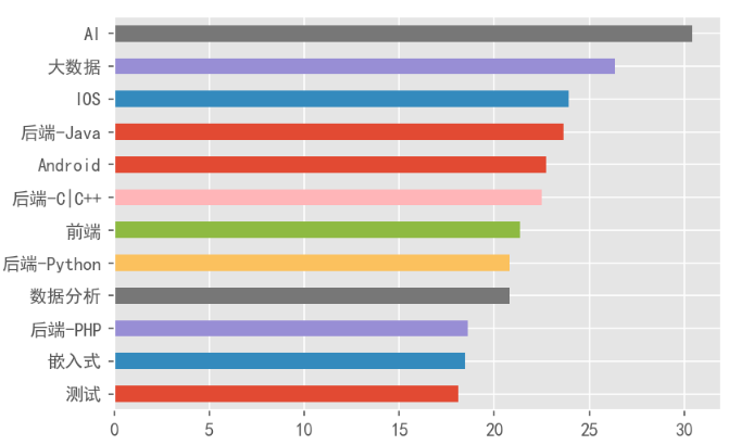 AI岗位的薪资最高,平均每个月30k以上;其次是大数据岗位,平均每个月26k左右,iOS的平均薪资比Android稍微高一些。另外,目前的前端岗位平均薪资偏低。